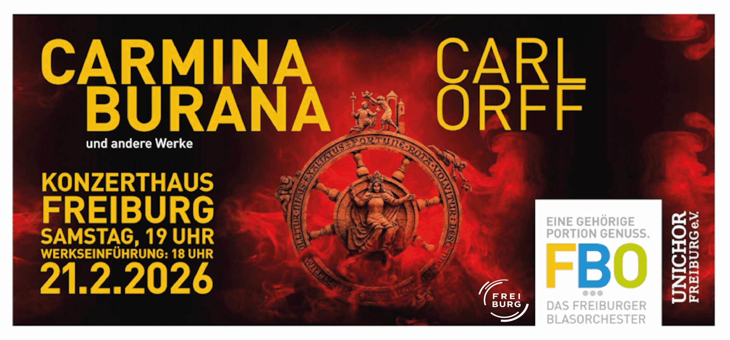 Unser nächstes Projekt wird dann richtig groß: Wir werden am 21. Februar 2026 zusammen mit dem Freiburger Blasorchester Carl Orffs Carmina Burana im Konzerthaus Freiburg aufführen.